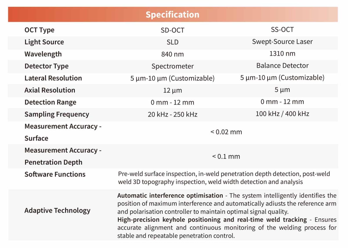 Coaxial Optical Architecture: Coaxial alignment of the welding laser and OCT measurement beam ensuresprecise targeting and synchronised detection.